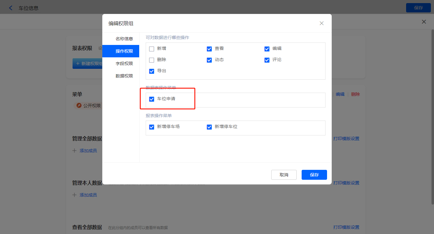 4)设置报表的权限,填入权限组名称,选择可操作的数据表菜单,点击【保存】;