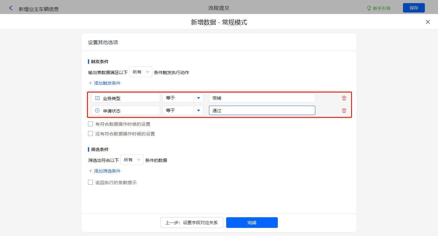其他设置触发条件为【业务类型】等于商铺且【申请状态】等于通过,设置好点击【完成】并保存该数据助手;