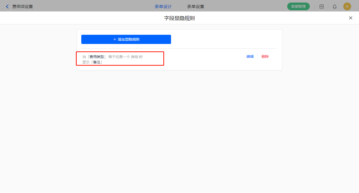 1)设置显隐规则,当【费用类型】字段等于其他显示【备注】字段;