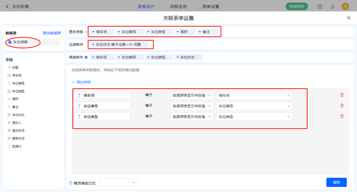 1)【申请车位】数据加载字段,数据源为【车位信息】,添加过滤条件及设置赋值字段;