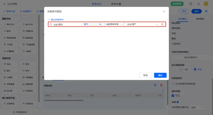| 身份证号码 | 单行文本 | 房屋信息 | 关联查询 |