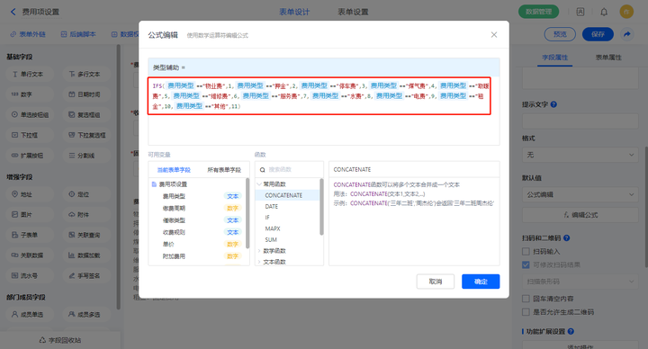 2)【类型辅助】字段,设置默认值为公式编辑,如图设置公式;