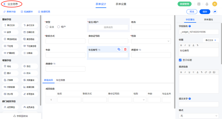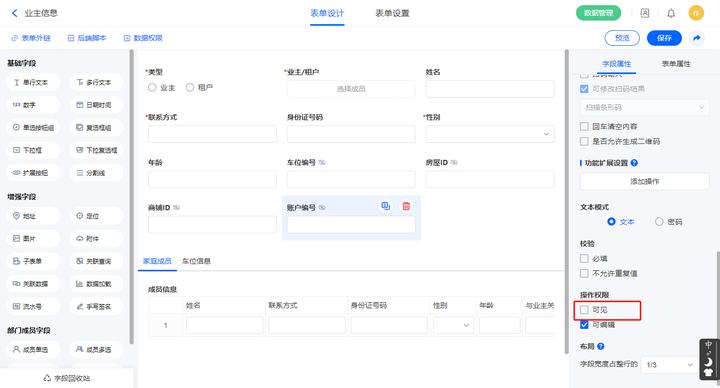 | 车位编号 | 单行文本 | 家庭成员/房屋信息/商铺信息/账户信息 | 多标签 |