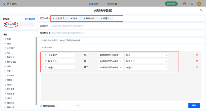 1)【选择业主】数据加载字段,数据源为【车位信息】,添加过滤条件及设置赋值字段;