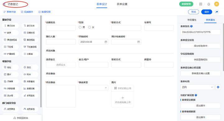 | 访客姓名 | 单行文本 | 选择业主 | 成员单选 |