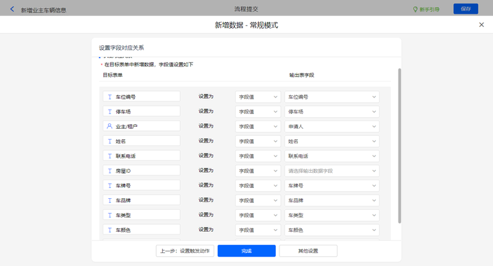 新增新增数据的执行动作,选择目标表单【业主车位】表单,设置对应的赋值字段;
