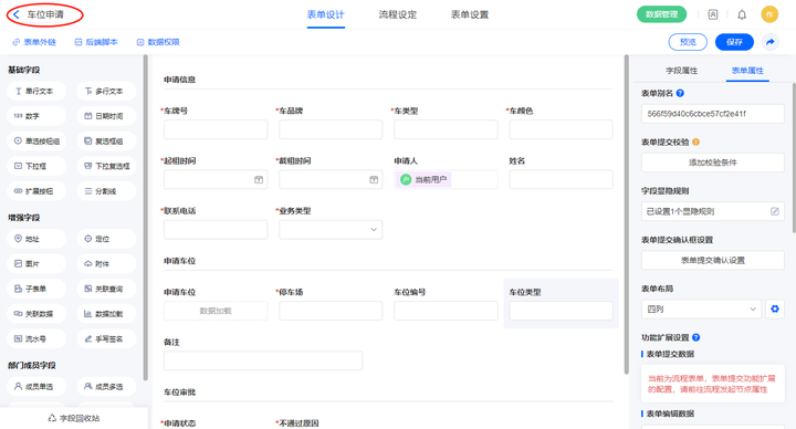 | 申请车位 | 数据加载 | 停车场 | 单行文本 |