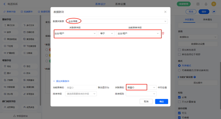 2)【房屋ID】字段,设置默认值为数据联动,设置联动条件及联动字段;