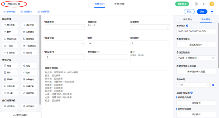 | 费用类型代码 | 单行文本 | 固定费用 | 数字 |