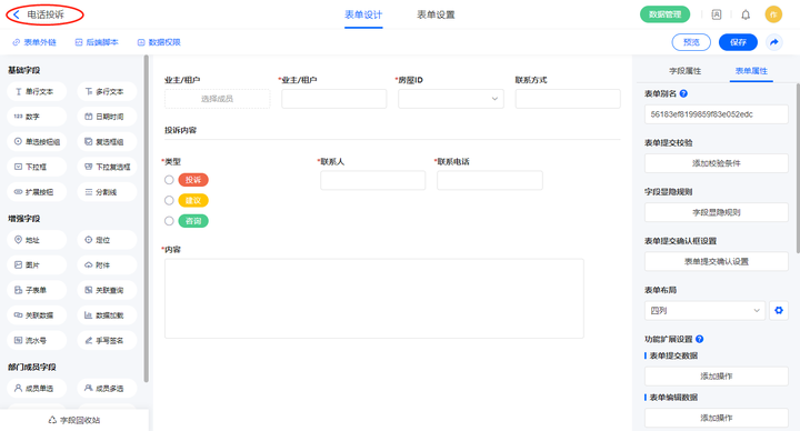 | 业主/租户 | 成员单选 | 房屋ID | 单行文本 |
