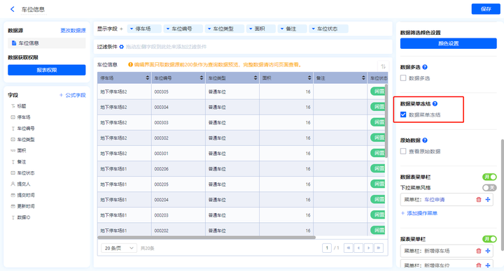 1)新增【停车位管理】报表,用基础报表【数据表】展示数据源为表单【车位信息】的数据;