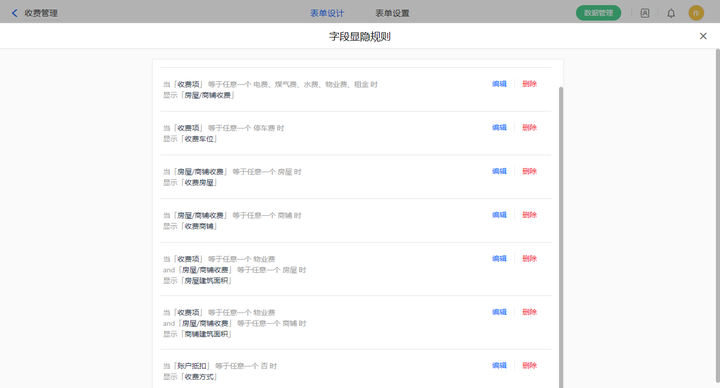 1)设置七条显隐规则: 当【收费项】字段等于任意一个电费、煤气费、水费、物业费、租金显示【房屋/商铺收费】字段; 当【收费项】字段等于停车费显示【收费车位】字段; 当【房屋/商铺收费】字段等于房屋显示【收费房屋】字段; 当【房屋/商铺收费】字段等于商铺显示【收费商铺】字段; 当【收费项】字段等于物业费且【房屋/商铺收费】字段等于房屋显示【房屋建筑面积】字段; 当【收费项】字段等于物业费且【房屋/商铺收费】字段等于商铺显示【商铺建筑面积】字段; 当【抵扣方式】字段等于否显示【收费方式】字段;