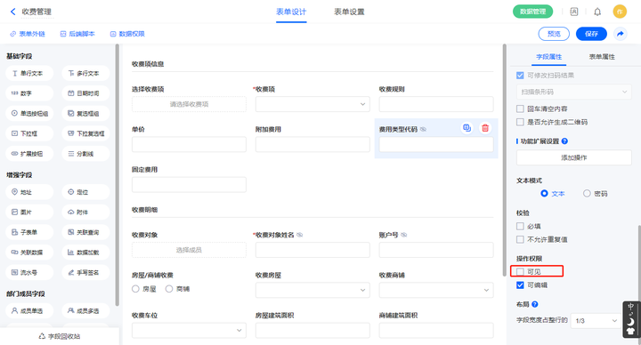1)选中【账户编号】、【车位编号】、【房屋ID】、【商铺ID】、字段,设置不可见;