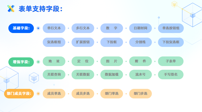 通过不断优化,现百数表单所支持自定义的字段有基础字段10个、增强字段10个、部门成员字段4个,可覆盖大多数用户的业务需求,仅通过拖拽,即可搭建符合实际场景的表单。