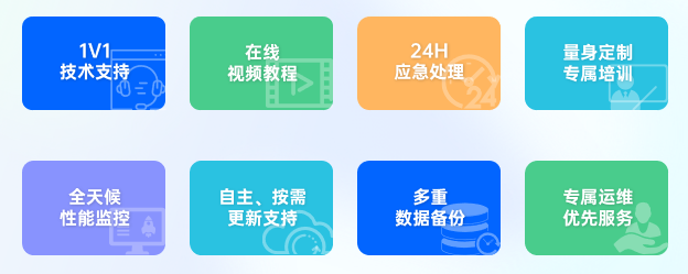 八大技术支持:1.专属运维优先服务 2.1V1技术支持 3.在线视频教学 4.24H应急处理 5.量身定制专属服务 6.全天候性能监控 7.自主、按需更新 8.多重数据备份