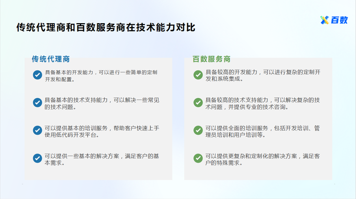 - 百数低代码服务商则具备丰富的低代码开发经验和技术能力,熟悉低代码开发平台的各种功能和工具,能够根据客户的需求进行应用设计和开发。