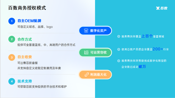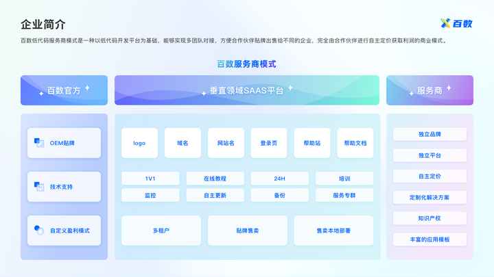 - 百数低代码服务商的主要模式是给合作伙伴提供垂直领域的OEM低代码平台,并且支持自定价来服务自己的客户。