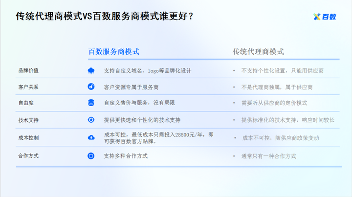 百数的服务商模式的采购价格以及所有性能增配的价格都是公开透明的,不会在后期对服务商强制收取额外的费用。服务商对于自己的客户可以根据自己的需求和目标,自主决定如何使用和控制成本,以确保经营的可持续性和盈利能力。