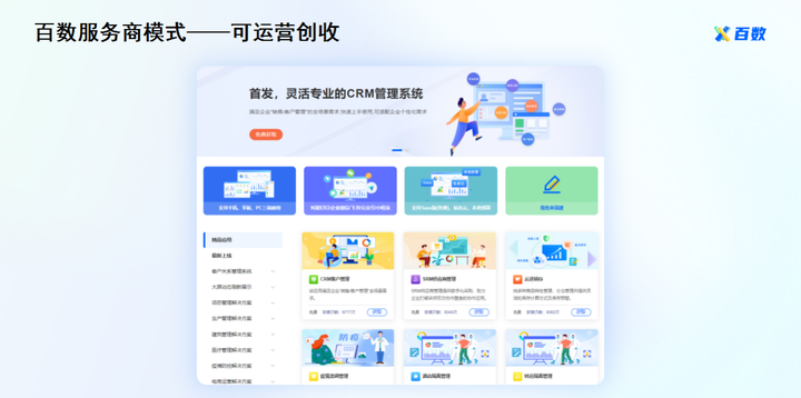 百数服务商模式支持复用百数应用中心所有应用模板,支持覆盖大中小型企业所需的解决方案,可以应对低中高规模的客户群体,匹配不同的产品模式,帮助服务商更好的进行创收。