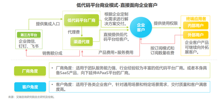 低代码代理商可以针对企业客户的不同需求提供产品和服务,企业的通用性需求可以通过提供低代码平台产品给企业端专业研发人员或业务人员自行开发,当通用模块无法满足企业特定需求时,可以通过低代码平台厂商进行定制化解决方案沟通,通过产品+实施服务满足企业需求。