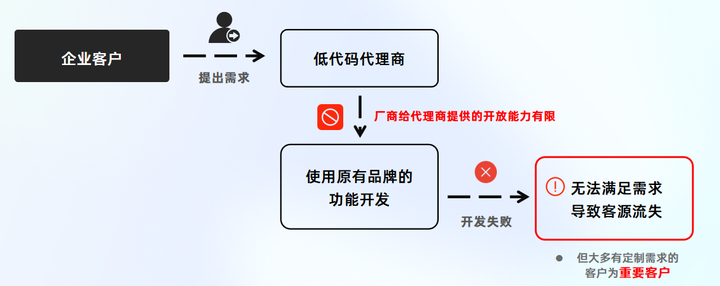 尽管低代码厂商会为代理商提供一些预置的组件和功能,但无法满足所有客户的需求,需要代理商的技术人员去实时开发,可是在平台又有一定限制,无法实现企业二次开发的需求。