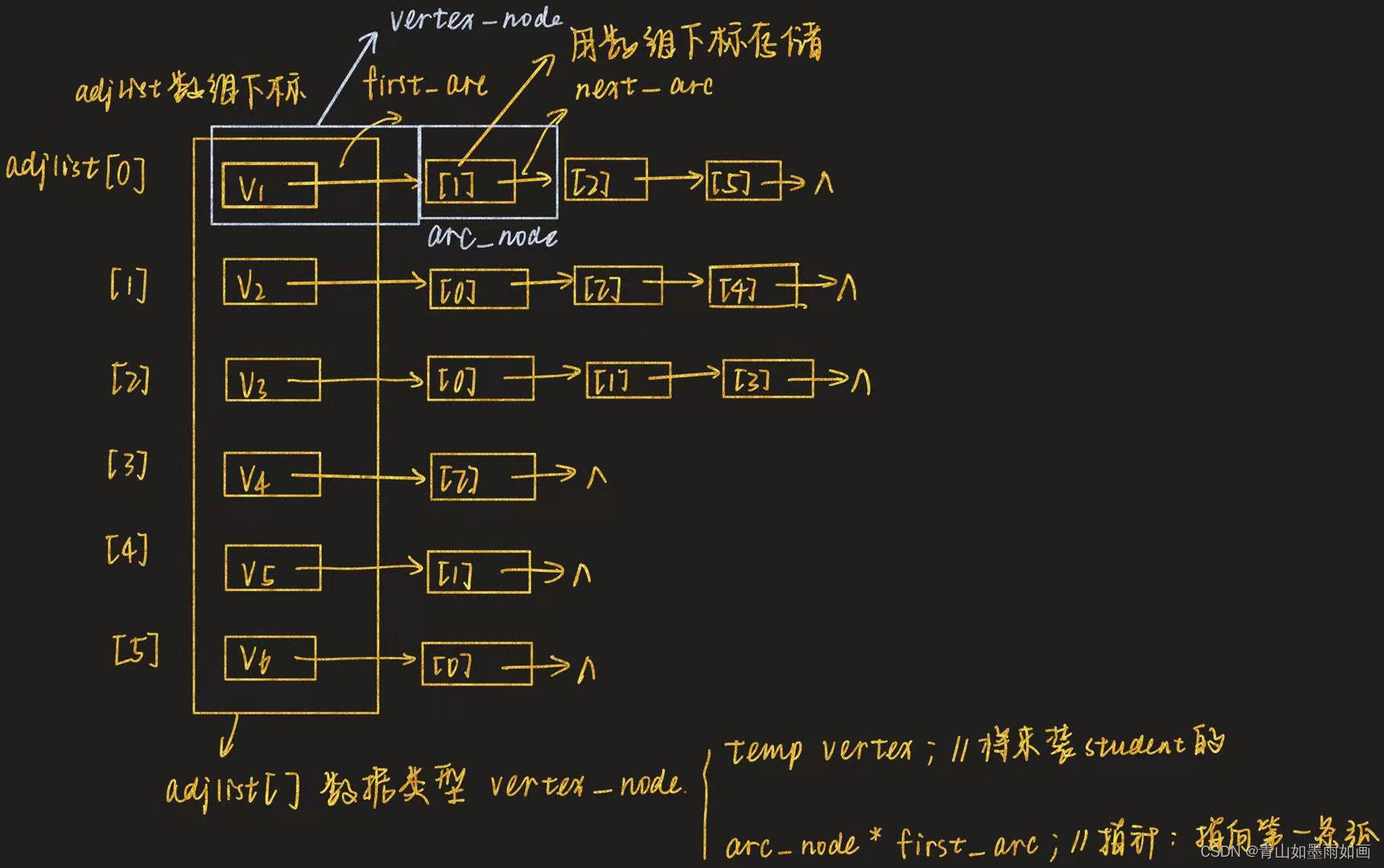 因为邻接表存储结构中链表数量不单一,所以单独拿出来讲一下。