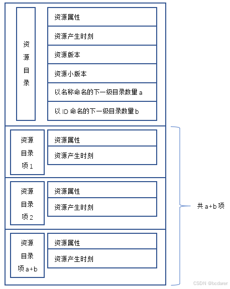 资源表数据从第一级资源目录开始。资源的每一级目录都会有一个资源目录头,它标识 了该类资源的属性、创建日期和版本等信息,其中也包含了随后的目录项的数量描述信息。 详细结构定义如下: