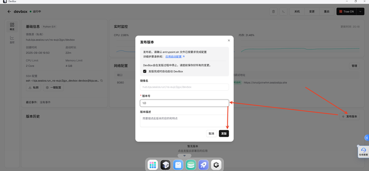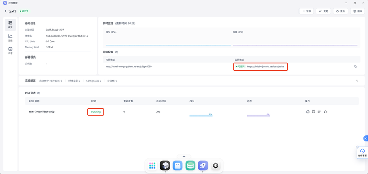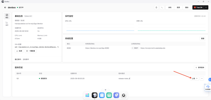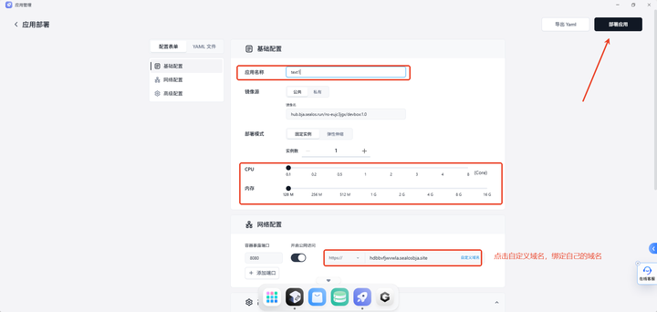 点击上线,发布至生产环境,根据项目大小,调整cpu内存,也可以绑定自己的域名