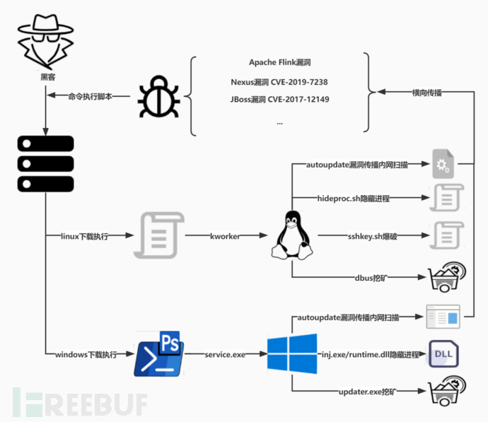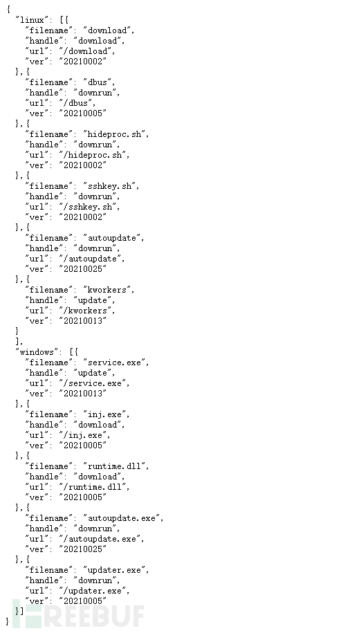Service.exe和kwokers分别是windows和linux的主体控制模块,其功能是一致的都是根据配置文件windowsupdatev1.json下载、执行或更新其他功能模块,如挖矿模块dbus/update.exe、横向传播模块autoupdate等。