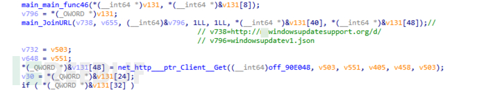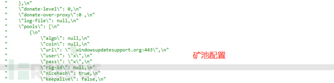 Windows端下载update.exe挖矿模块进行挖矿,Linux端下载dbus挖矿模块进行挖矿。两文件本质都是开源矿机XMRig,该病毒应该使用的是代理矿场,矿场地址便是其C2服务器:m.windowsupdatesupport[.]org:443,配置信息如图: