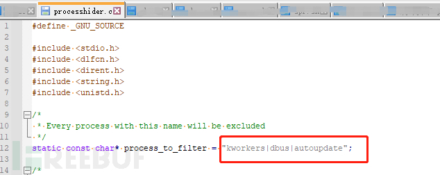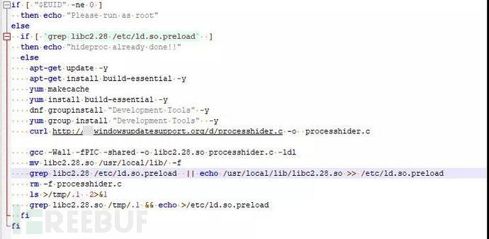 Kworkers下载hideproc.sh进程隐藏脚本,该脚本下载processhide.c隐藏进程源文件,再将源文件编译成libc2.28.so,最后将libc2.28.so添加到系统的ld.so.preload文件,即实现启动进程时自动载入该链接库实现进程隐藏。
