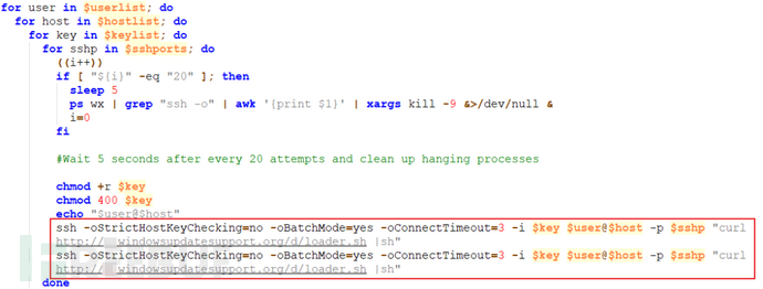 key,并尝试使用这些用户名和密钥登陆其他主机,进一步进行横向传播,当登陆成功便下载执行前置loader。