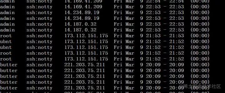 通过依次分析这3个脚本,就能看出这个病毒的可怕之处,先是通过写入ssh public key 拿到登录权限,然后下载执行远程二进制文件,最后再通过redis漏洞复制,迅速在全网传播,以指数级速度增长。那么问题是,这台服务器是怎么中招的呢?看了下redis.conf,bind的地址是127.0.0.1,没啥问题。由此可以推断,应该是root帐号被暴力破解了,为了验证我的想法,我lastb看了一下,果然有大量的记录: