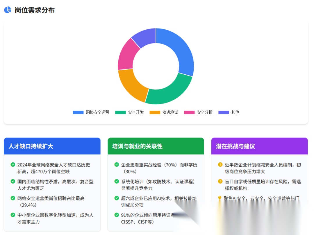 2024年全国网络安全职位空缺44.8万个,已就业人数约109.8万人,供需比为82%。表面看岗位充足,但实际存在“高需求与低匹配”矛盾: