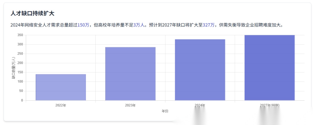 2024年网络安全人才需求总量超过150万,但高校年培养量不足3万人。预计到2027年缺口将扩大至327万,供需失衡导致企业招聘难度加大。全球层面,网络安全职位空缺达350万个,中国作为数字经济大国或地区,需求尤为迫切。
