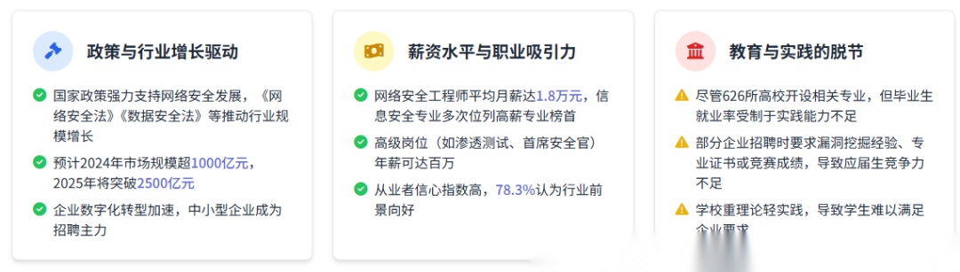 尽管626所高校开设相关专业,但毕业生就业率受制于实践能力不足。部分企业招聘时要求漏洞挖掘经验、专业证书或竞赛成绩,导致应届生竞争力不足。超六成在校生对行业前景乐观,但持“非常乐观”态度的比例下降,悲观情绪有所上升,反映市场不确定性对就业预期的影响。