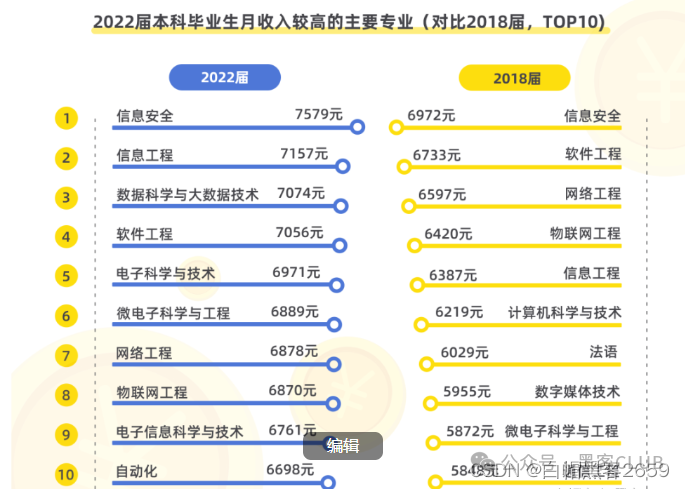 具体看专业,2022届本科月收入较高的专业是信息安全(7579元)。对比2018届,电子科学与技术、自动化等与人工智能相关的本科专业表现不俗,较五年前起薪涨幅均达到了19%。数据科学与大数据技术虽是近年新增专业但表现亮眼,已跻身2022届本科毕业生毕业半年后月收入较高专业前三。五年前唯一进入本科高薪榜前10的人文社科类专业——法语已退出前10之列。