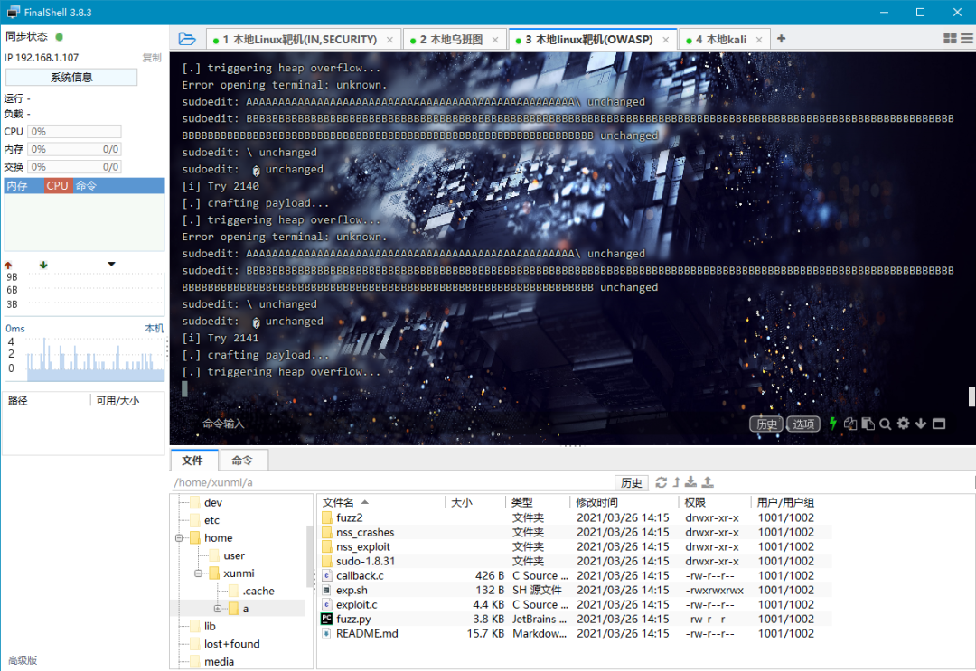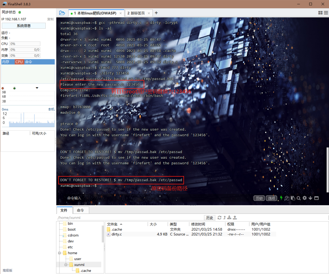 # https://raw.githubusercontent.com/FireFart/dirtycow/master/dirty.c,这是攻击载荷的文件,如果将文件传入目标机器就靠你自己了!我用的shell(FinalShell)终端有非常方便的拖拽导入。