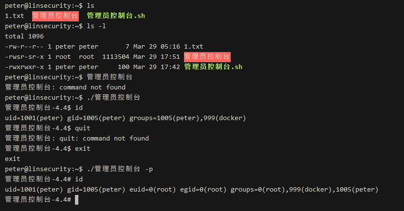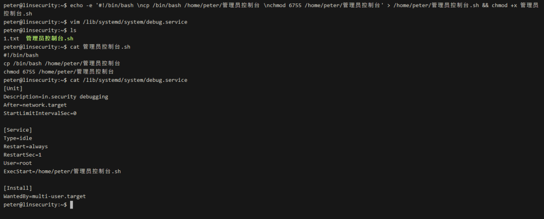 echo -e '#!/bin/bash \ncp /bin/bash /home/peter/管理员控制台 \nchmod 6755 /home/peter/管理员控制台' > /home/peter/管理员控制台.sh && chmod +x 管理员控制台.sh