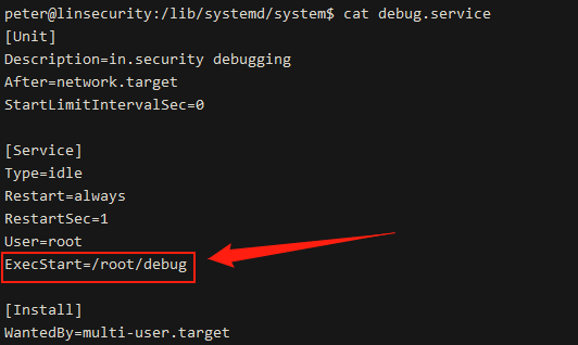 首先我们还是需要找到一个可以用超级管理员省份执行的目标,我这里使用/lib/systemd/system下的debug.service