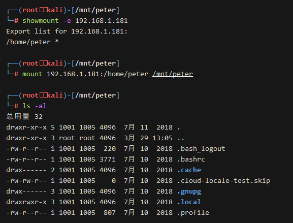 挂载完成后,我们就可以看到目标文件,但我们对此目录是没有写入操作权限的,因为我的超级管理用户是被压缩成了匿名用户。