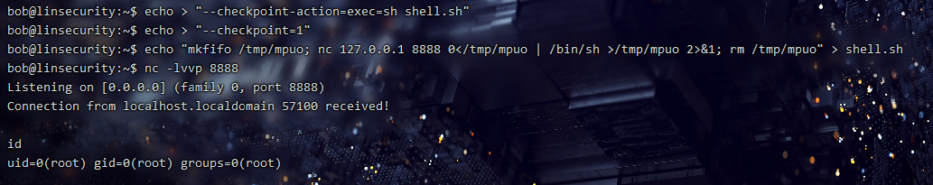 # tar -zcf /etc/backups/home-bob.tgz --checkpoint=1 --checkpoint-action=exec=sh shell.sh shell.sh