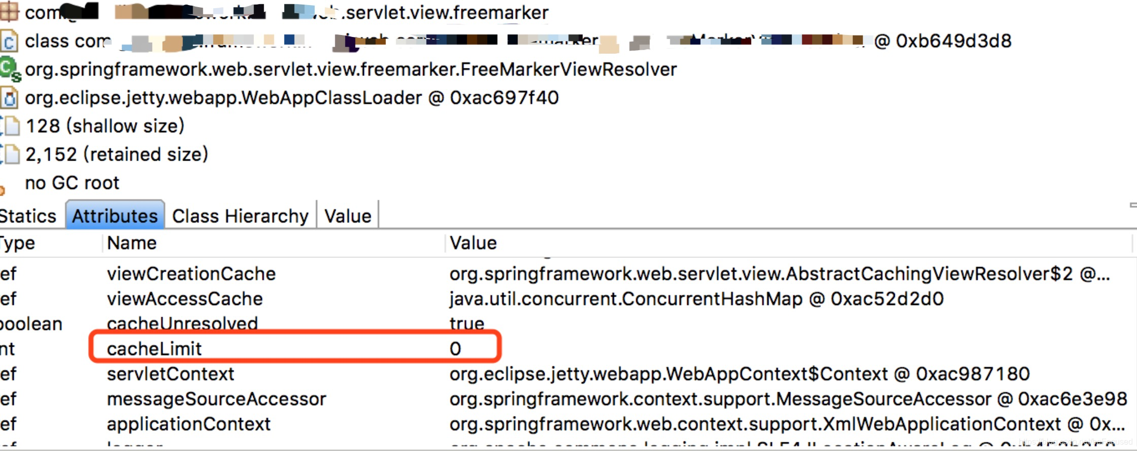 从疑点(2)"机房A中其它机器执行一次模拟请求后就正常了"这个现象判断,大概率是因为这个请求有缓存,执行一次模拟请求正常后,之后的这个页面请求都能命中缓存所以就不打印异常日志了(freemarker的缓存使用可以参考freemarker缓存)。那么疑点(1)疑点(2)归为一个点就是为啥机器A-1一直不能命中缓存?同一个机房的配置肯定是相同的这个毋庸置疑。机器A-1怎么没有缓存?最后祭出杀手锏jvm dump分析,dump一份机器A-1的内存现场下来,打开看看freemarker的缓存配置果然没有生效。