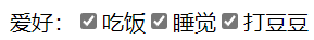 爱好:<input type="checkbox" />吃饭<input type="checkbox" />睡觉<input type="checkbox" />打豆豆