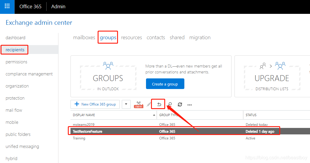 还原团队【访问:Office 365 Admin Portal -> Exchange Admin Center】