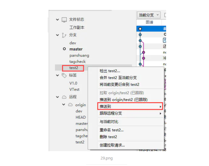 在sourcetree右侧内容中的分支列表中,选中创建的分支,右键提交,如图所示: