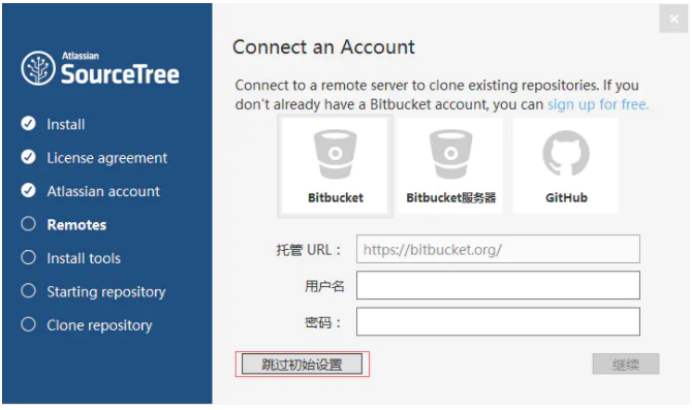 点击“install”,安装完成后,打开sourcetree,点击“user an existing account”,如图