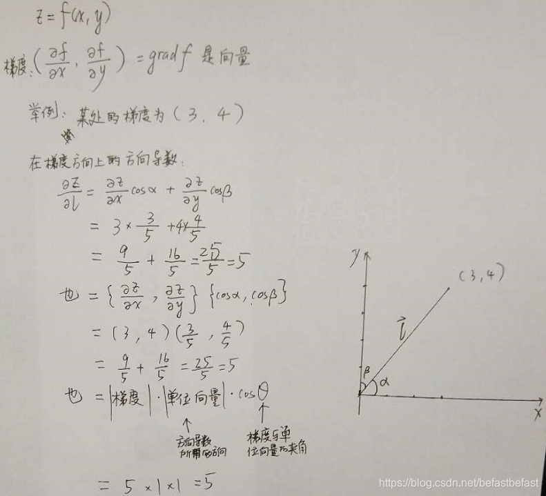 - 方向导数 = cos(θ) × 梯度,因此,所有的下降方向中,梯度方向下降最多。θ为方向导数所取方向与梯度的夹角。